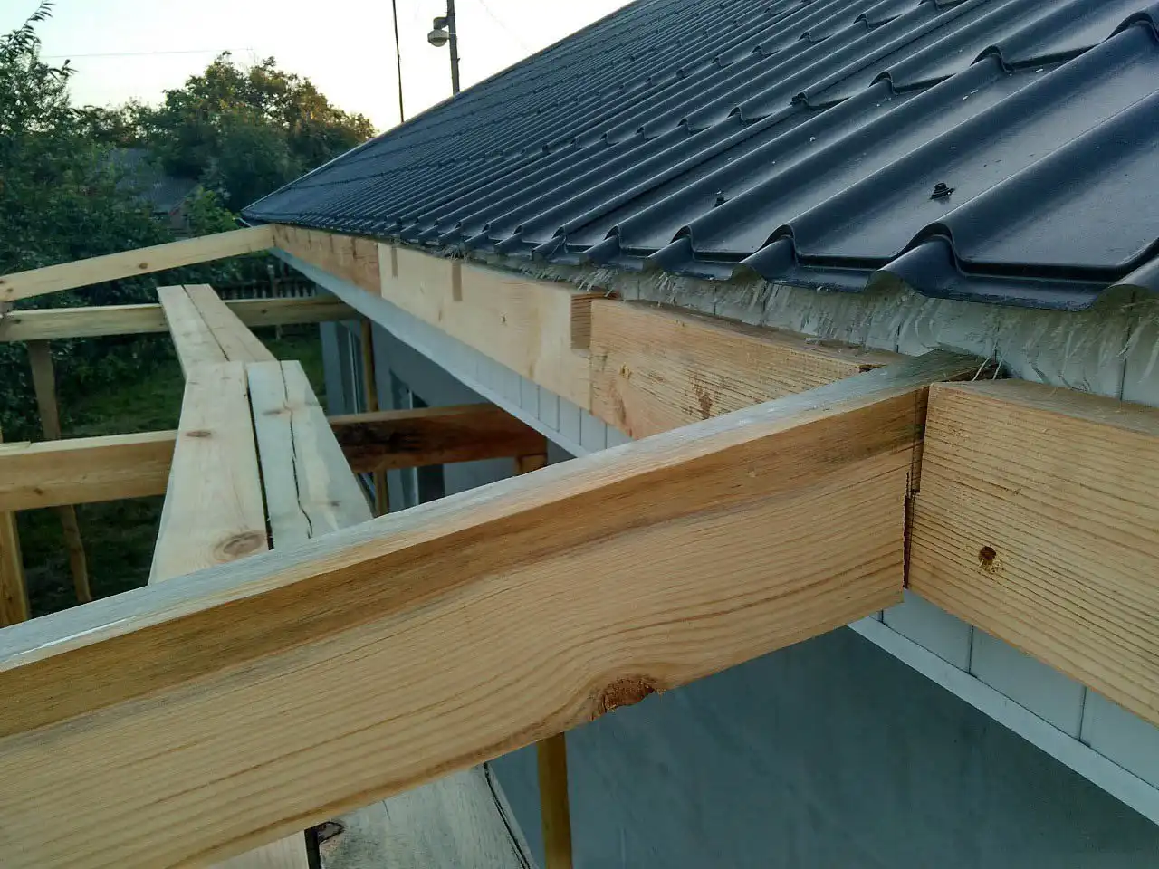 Так решил крепить стропила под крышей. Направляющая «доска» крепится к коробке крыши и плюс подставляются опоры с горизонтальных балок (фото нет)