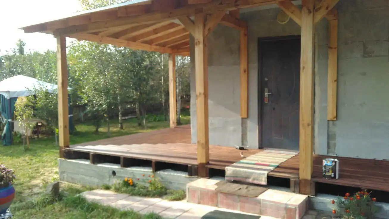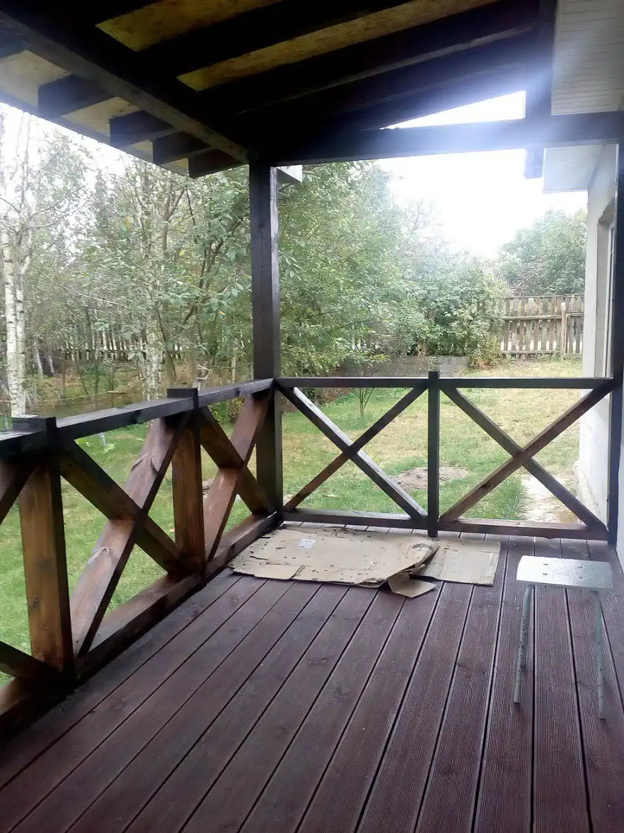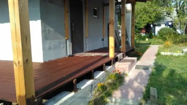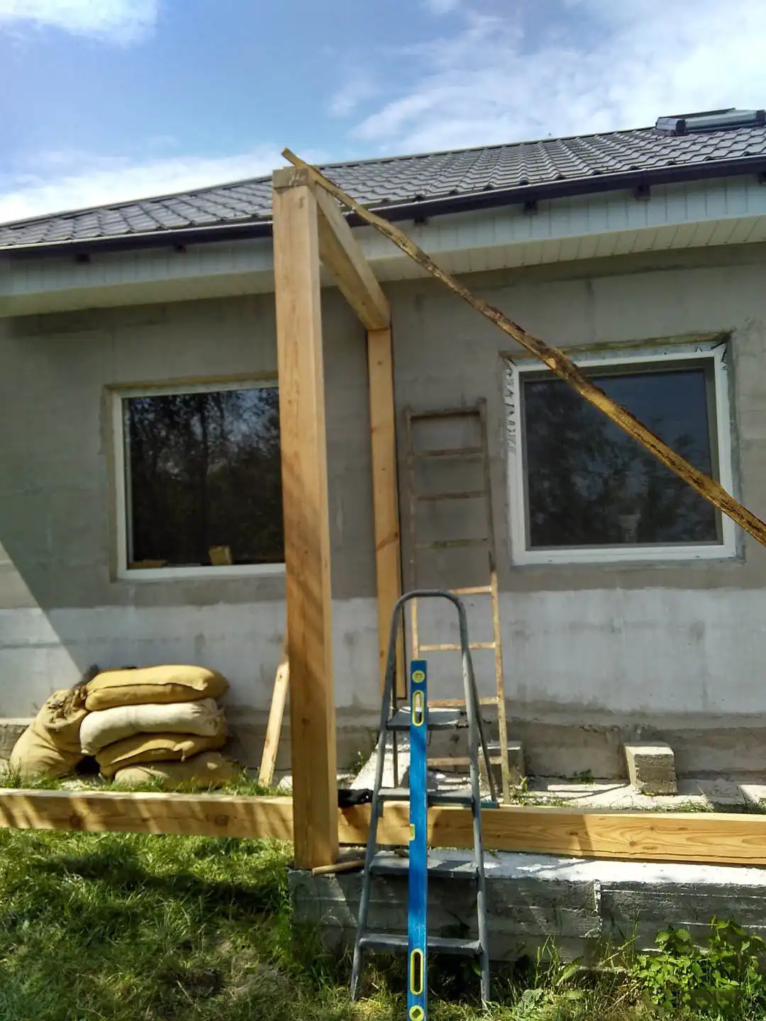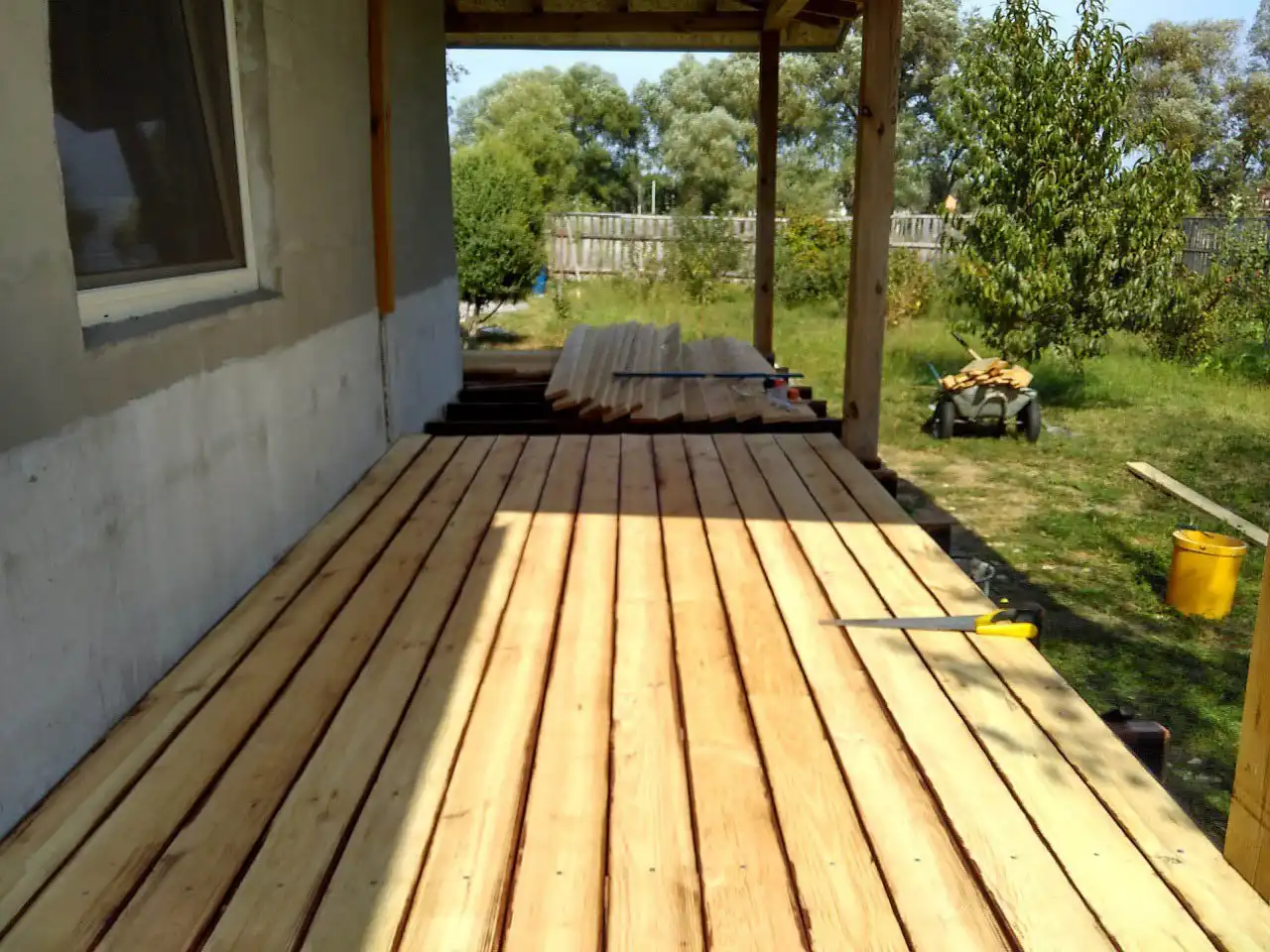 Все делал с отцом, строил этим летом, затраты приведу в баксах, чтобы не морочиться с переводом валютой. Дом построен давно и после пожара, многие стены кривые – виляют, так что пришлось постараться сделать ровную террасу.