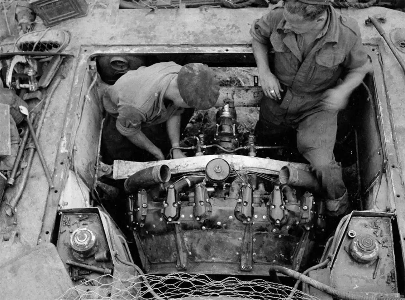 Ронни Грант и Сид Хикс ремонтируют танковый двигатель, 1944г.
