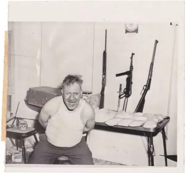 20 января 1962,"Паскуале 'Джо' Фука, 60 лет, скалится на полиции, на фоне мешков чистого героина весом 24 фунтов на сумму $ 3,5 млн.Полиция сообщила , что героин плыл контрабандой из Франции на борту роскошного лайнера.