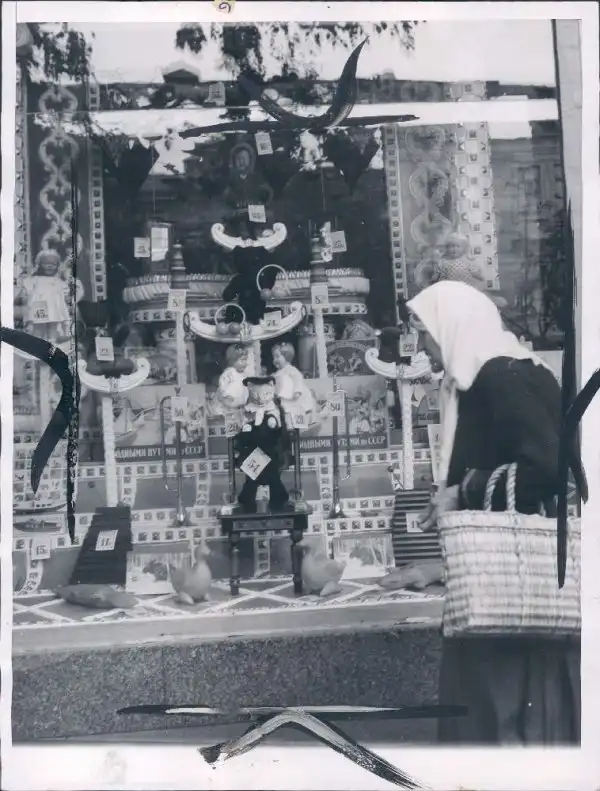 Киев. Универмаг, витрина с игрушками, 1955 год: