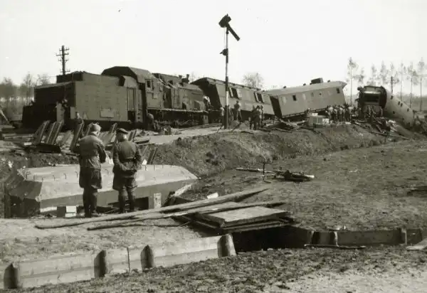 Подъезжая к границе бронепоезд подорвался и сошёл с рельс. Ситуацию осложнило то, что по поезду тут же открыли огонь из скрытно занятых голландцами приграничных укреплений (видны на фото). Только в результате серьёзных усилий, с привлечением Люфтваффе, командованию вермахта удалось спасти экипаж от полного уничтожения.