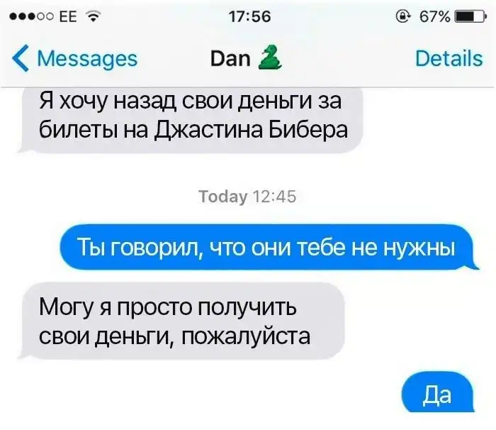После того как пара распалась бывший парень Харриет по имени Дэн Браун попросил девушку вернуть ему деньги за билет на Джастина Бибера. Девушка согласилась вернуть ему деньги, но сделала это не совсем обычным образом.