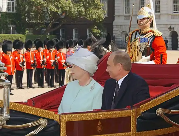 Президент России Владимир Путин и королева Великобритании Елизавета Вторая отправляются в карете в Букингемский дворец:
