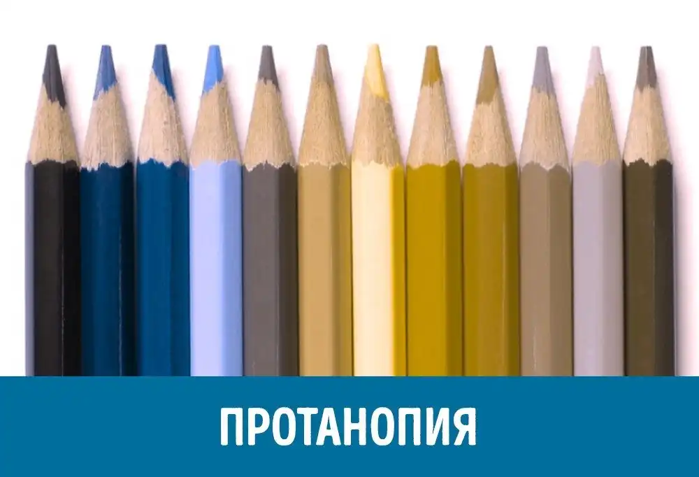 Протанопия — схожее нарушение, но встречается оно реже, примерно у 1 % мужчин. Все оттенки зеленого и красного блекнут, синие и желтые оттенки остаются почти без изменений.