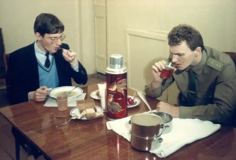 Матиас Руст (слева), 18-летний немецкий пилот-любитель, поразивший мир посадкой своего самолета на Васильевском спуске в мае 1987 года, обедает в суде. Юрий Абрамочкин, 1987 год: