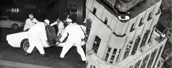 Специальная команда исследовала размеры дверей, коридоров и лифтов и определила, что белый кабриолет Mustang можно разобрать на четыре основных части и с помощью лифта доставить на крышу.20 октября 1965 г. в 10:30 вечера команда техников Форда в белых комбинезонах начала разборку автомобиля-альпиниста — прямо на глазах у изумленной публики.
