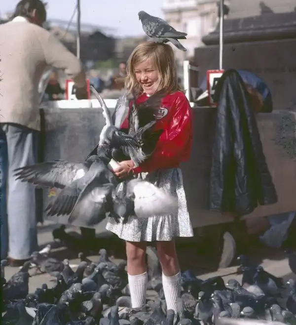 Лондон. Трафальгарская площадь. Девочка и голуби
