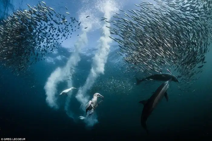 Абсолютный победитель фотоконкурса Siena International Photo Awards. Морские хищники охотятся на мигрирующих сардин у берегов ЮАР. Фотограф: Greg Lecoeur.