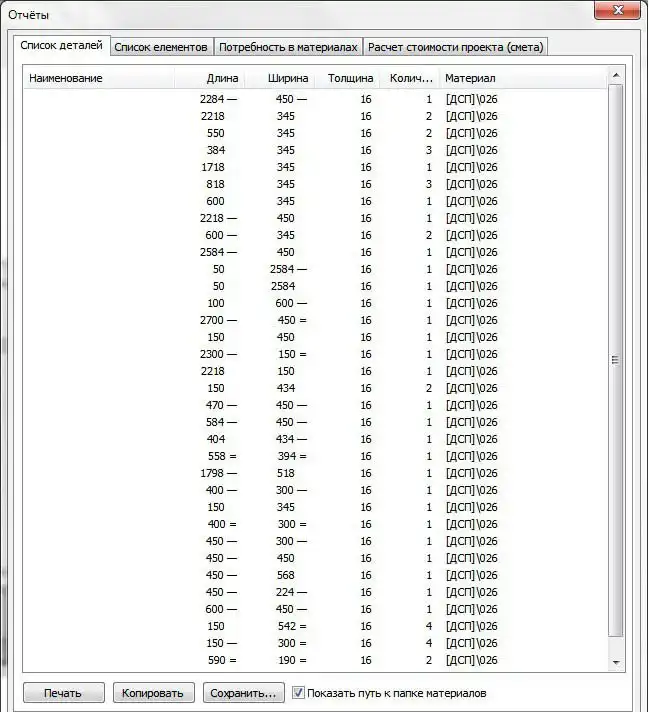 В итоге программа выдала вот такие расчёты, с ними я пошел в компанию которая занимается продажей и распиловкой ЛДСП.