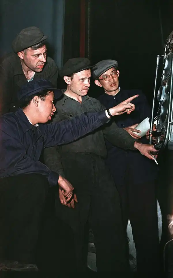 Китайские практиканты на заводе тяжелых станков в Новосибирске, фото С Фридлянда, 1956: