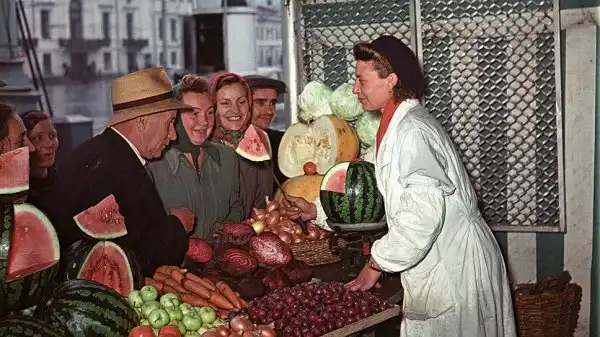 Продажа овощей и фруктов на Трубной площади в Москве. Яков Рюмкин, 1956: