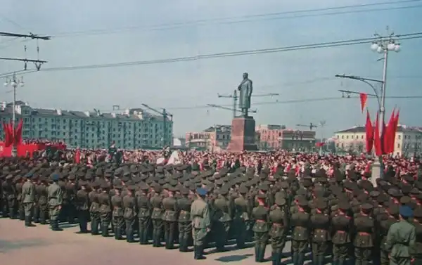 "Развенчание культа личности" на ХХ съезде носило полутайный характер и до массового сноса памятников дело дойдёт ещё очень не скоро (в самом конце 1961 года), поэтому митинги и парады 1956-го ещё проходят под сенью статуй вождя.