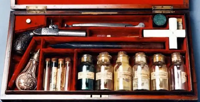 Внушающий страх чемодан выглядит так, будто его изъяли у маньяка или забрали на память со съемок очередного голливудского фильма о вампирах. Но на самом деле такой набор — не бутафория и не аксессуар на Хеллоуин, а вполне реальная вещь из жизни наших предков.