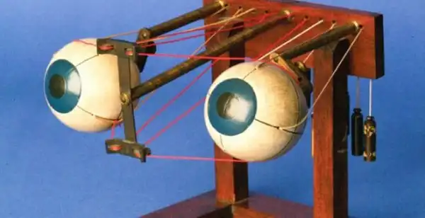 По сути, это просто модель глазных яблок (они выполнены как полые шары, движущиеся вокруг собственного центра вращения). Глазные яблоки приводятся в движение глазными мышцами — роль мышц здесь выполняют шесть шнуров, прикрепленных в разных местах к глазным яблокам и отходящих назад, как и в настоящих глазах. Все шнуры перекинуты через блоки и уравновешены гирьками. Натягивая тот или иной шнур, соответствующим образом вращают модель глазного яблока.