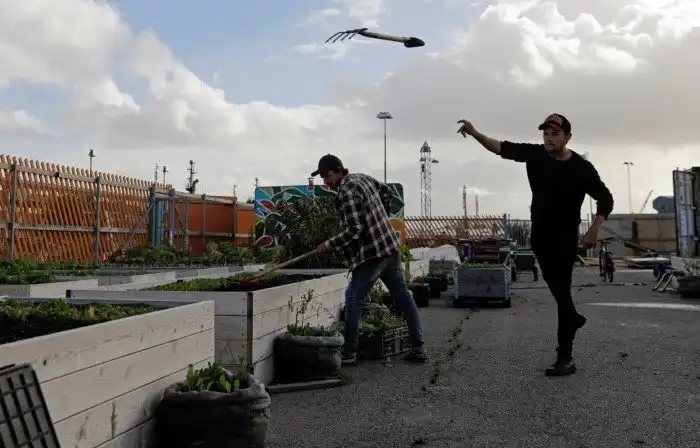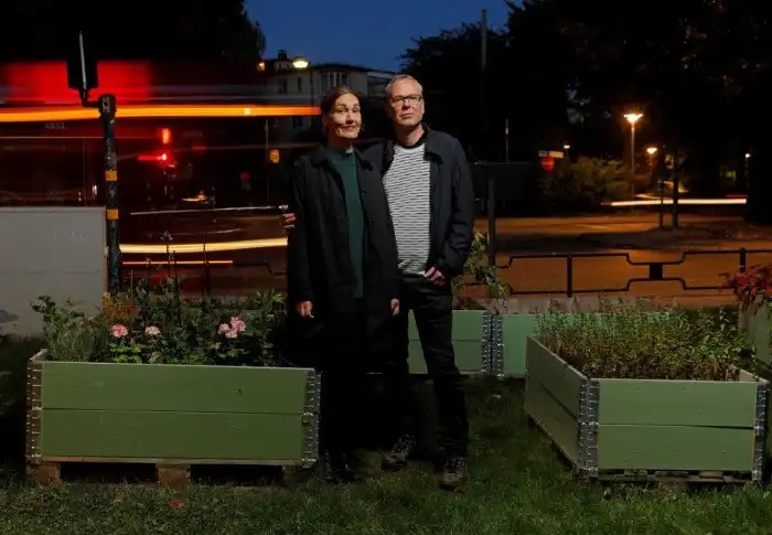 Пара садоводов у своих грядок в Стокгольме, Швеция, 26 сентября 2016. Сзади можно видеть город, обычную улицу, светофоры и проезжающий транспорт.