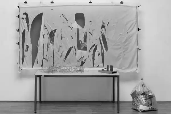Пакет мусора, лежавший рядом с с нейлоновой, разъеденной кислотой картиной, на самом деле представлял из себя произведение искусства - инсталляцию немца Густава Метцгера, с названием «Восстановление первой публичной демонстрации авторазрушающегося искусства». Уборщица просто выкинула пакет с мусором...