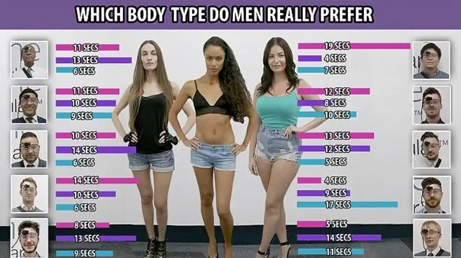 Собрали 10 добровольцев и вооружили их глаза устройством слежения, чтобы эксперимент получился беспристрастным, а на слова молодых мужчин исследователи не полагались – и правильно делали, все для того, чтобы узнать, нравится ли им пышные, спортивные или тоненькие женщины ... так, кто получил наибольшее внимание?