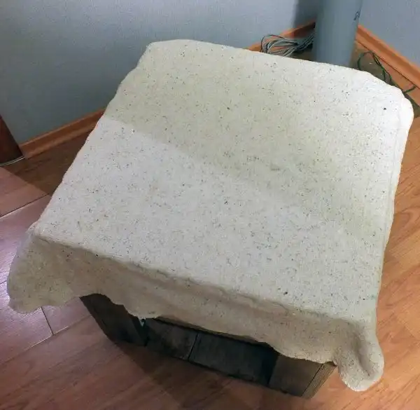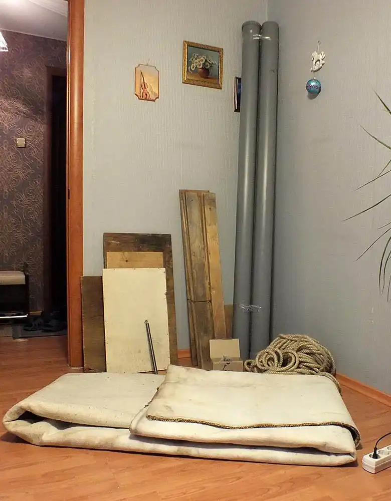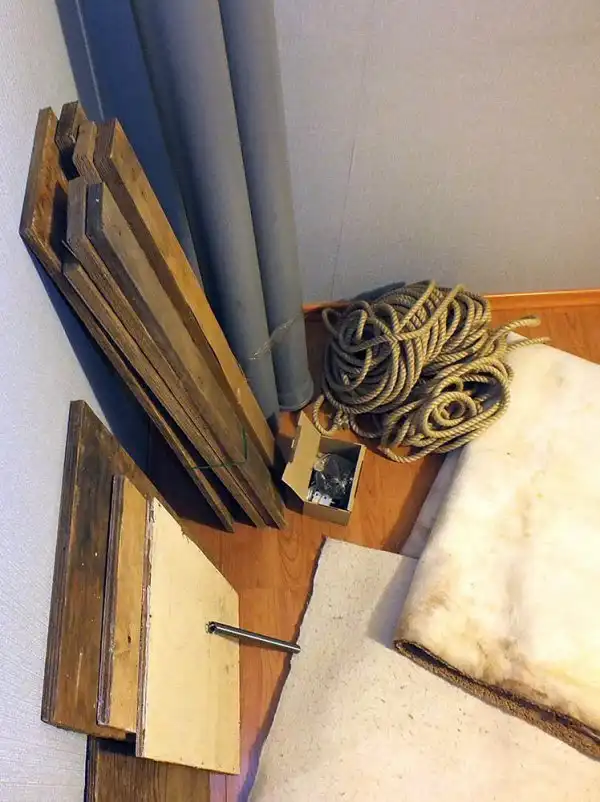 Пришлось идти в гараж и рыться в сокровищах. Удалось найти почти все, что нужно: палас в хорошем состоянии, обрезки березовой фанеры, им по-моему лет по 20, кусок ватина и пригоршню шурупов. Пришлось докупить веревку 20 м. и 2 трубы сантехнические.