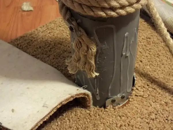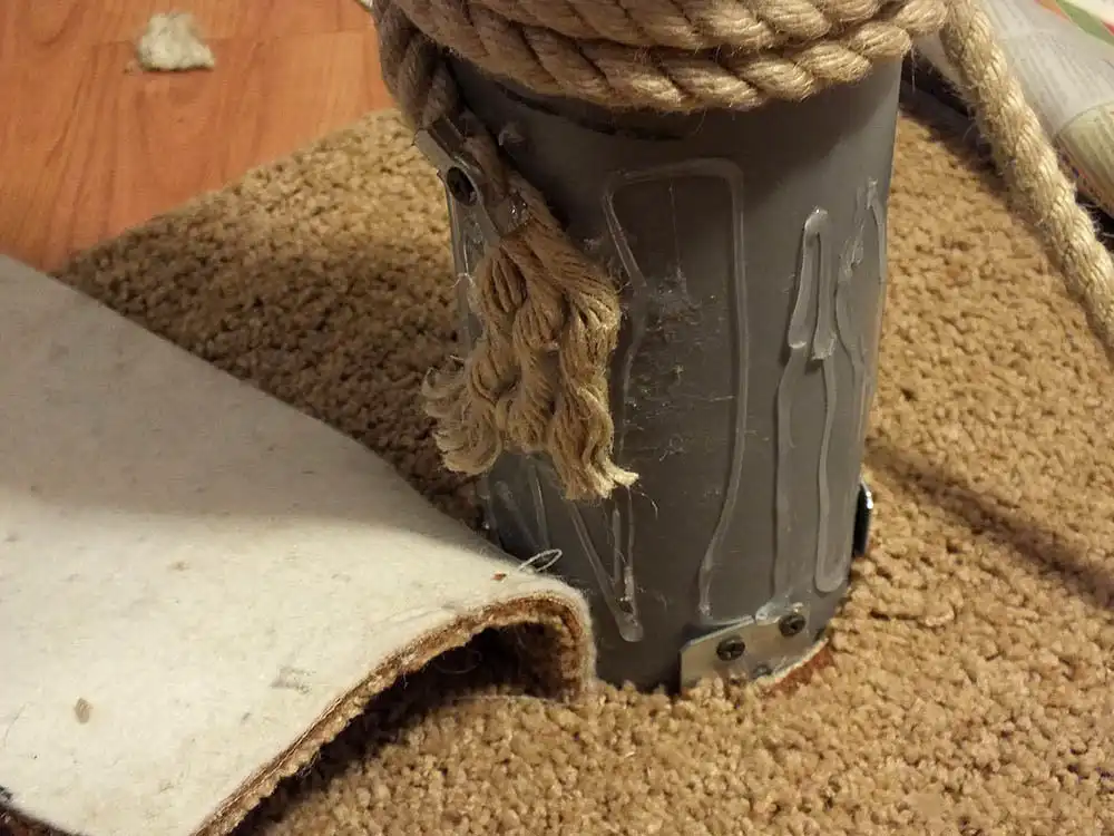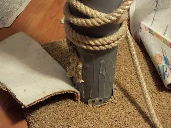 Пытался приклеить веревку на герметик, но идея себя не оправдала. Крепил на шурупы каждый 10 виток.