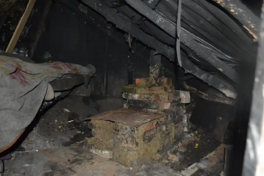 Я заглянула в шалаш, и увидела печку и доски для сна. Вот шалаш внутри.