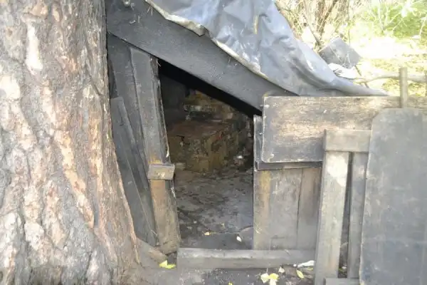 В этом шалаше они живут и в морозы -30, то есть всегда. Шалаш обогревается печкой.
