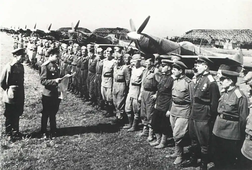 Летный состав 26 гвардейского ИАП ПВО Ленинграда на построении в апреле 1945 года
