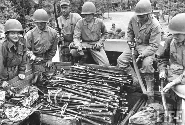 Американские солдаты у сданных японцами армейских мечей син-гунто.