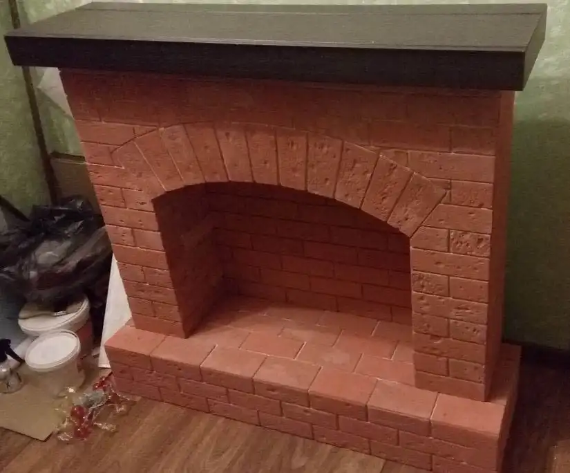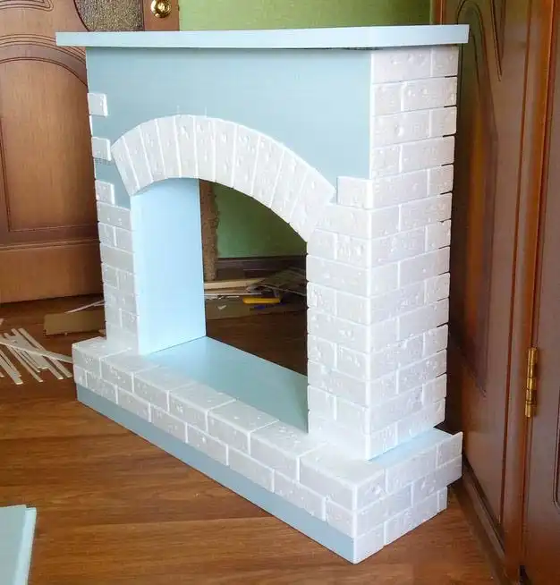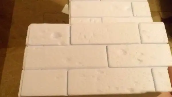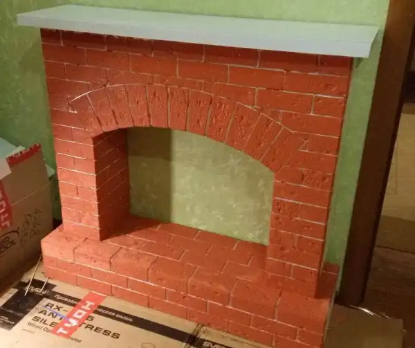 Придуман такой способ. Берем потолочную плитку (без узора, самую простую), режем ее на кирпичи. Ватным диском смоченном в ацетоне сглаживаем кромку. Наливаем ацетон в распылитель и издалека брызгаем на кирпичи до тех пор пока не получим поверхность, похожую на камень. Способ очень понравился, производительность колоссальная, можно за час сделать кирпичей на весь камин если бы не первый косяк (тот что с размерами основания). В итоге пришлось вымерять, рассчитывать размеры кирпичей чтобы они укладывались целиком и выглядели более менее похожими на остальные. Это отняло много времени.