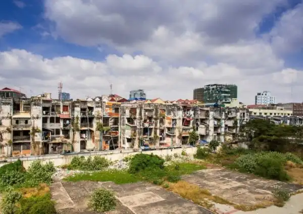 На фото — куда менее известный проект, но история чем-то похожа. “Белое здание” начали строить в столице Камбоджи Пномпене прямо посреди трущоб, и оно было вообще первая многоэтажка в Камбодже. Первоначально в здании селились чиновники и богачи, но постепенно они переселились в другие места. Сейчас здание пришло в негодность и заселено преимущественно проститутками, монахинями и художниками. Хотя в здании уже появились крупные трещины, сноса отсутствует, так как большинство жителей категорически против переезда. Трущобы победили.