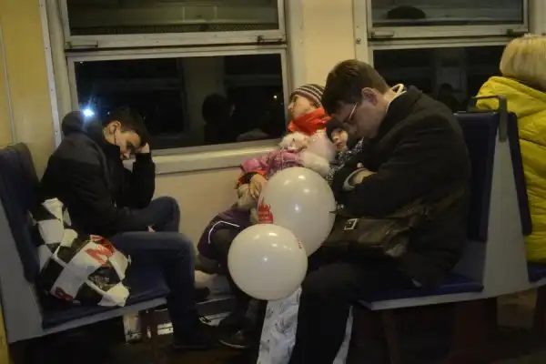 Спящая семья едет домой. Судя по шарикам они были в пиццерии. Мальчишка кашлял каждую секунду. Я еще подумала, надо б пересесть, но мне было так удобно на моем месте, что не пересела. Во всей электричке , наверное, был один сильнокашляющий пацан, и он сядет обязательно около меня!