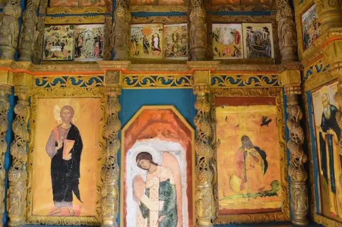 Иконостас четырехъярусный, царские врата резные, ажурные с шестью живописными клеймами (четыре евангелиста и архангел Гавриил с Богоматерью). Центральная часть иконостаса выделена по вертикали спаренными колонками, в навершии которых установлены фигуры предстоящих Распятию. Резьба иконостаса характерна для северного рококо, совмещавшего барочные витые колонки с гроздьями винограда, завитки и классически ясную симметрию композиции.