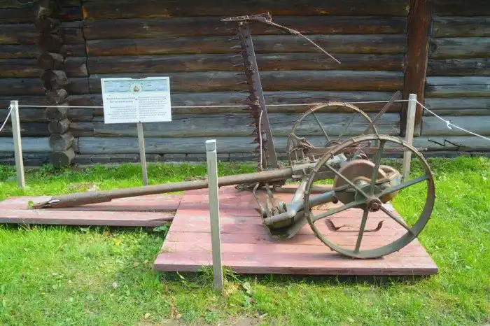 Пароконная сенокосилка 1940-х гг. для скашивания травы. Её рабочая часть включался в себя режущий аппарат, состоящий из пальцевого бруса, внутри которого движется нож. Такая косилка по производительности заменяла труд 8-12 косцов.