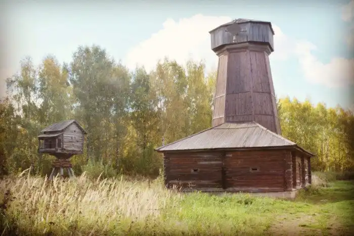 Справа — мельница-шатровка из деревни Спас Нерехтского района. Её основной объем с помещениями кладовых, и мукомольным механизмом неподвижен, а верхняя часть с крыльями может поворачиваться для установки против ветра. Постройка имеет трехъярусную композицию.