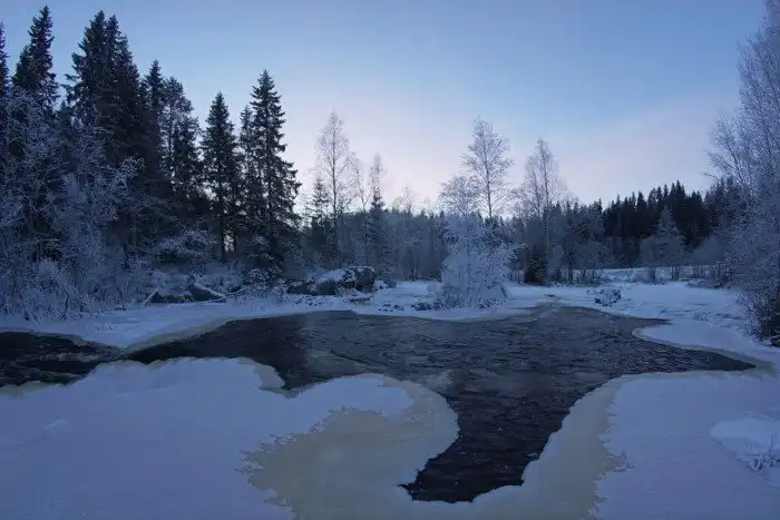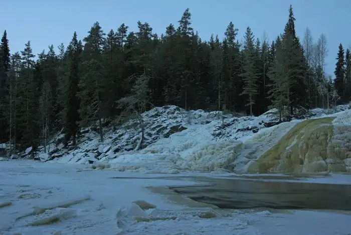 Это водопад Ахвенкоски. Часто я проезжал мимо и почти всегда останавливался, поэтому покажу вам серию времена года:) Зима: