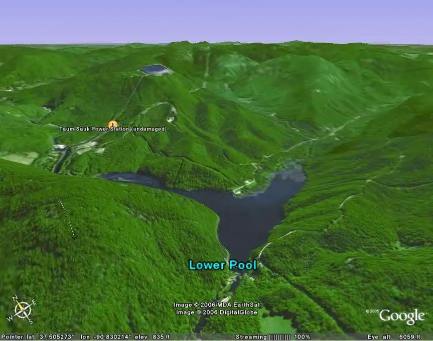 Taum Sauk Hydroelectric Power Station находится в горной области Миссури Озаркс примерно в 140 км к югу от Санкт- Луи вблизи Лестервилл, штат Миссури.