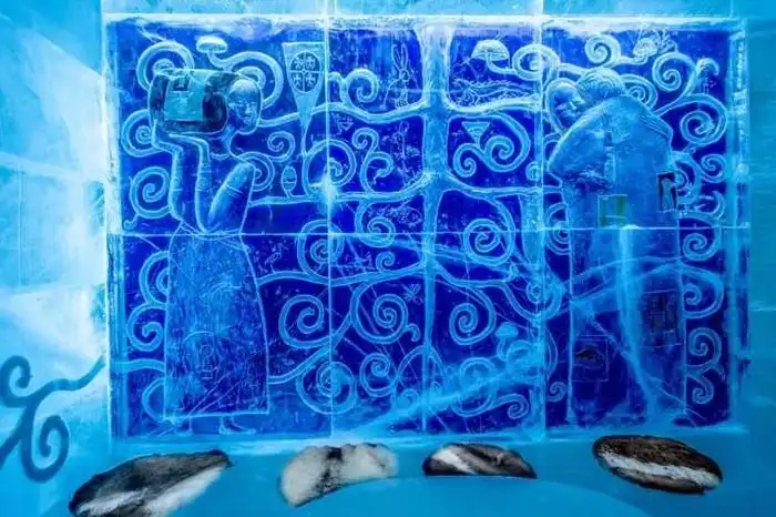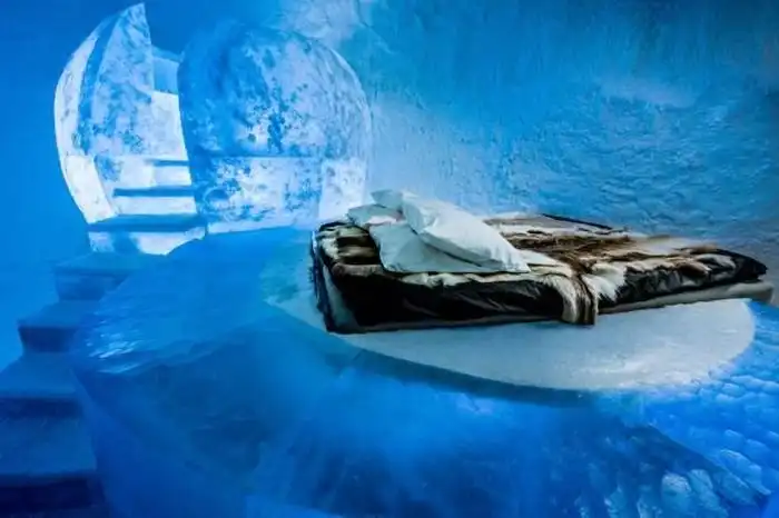 В шведском городе Юккасъярви находится уникальный ледяной отель, который полностью построен изо льда. Специальная технология поддерживает постоянную температуру в -5 градусов Цельсия, благодаря чему лед никогда не тает. В настоящий момент отель представляет собой целый комплекс с номерами и апартаментами, сауной, церковью, баром и несколькими зонами для отдыха. Изо льда здесь изготовлены даже кровати, которые сверху застелены оленьими шкурами, а каждому посетителю выдают теплый спальный мешок.