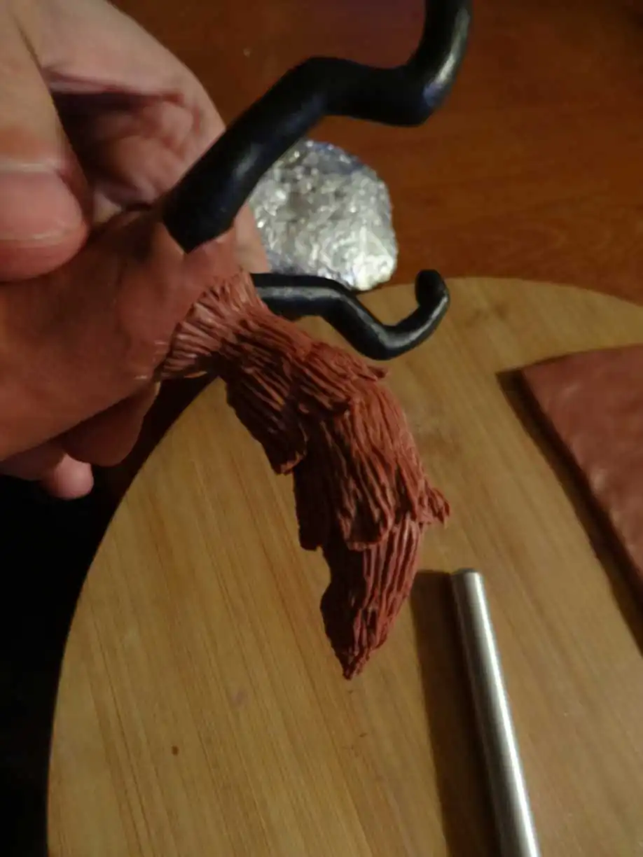 Вот он уже на спине. Где пальцами примяли поправляем инструментом. Чтоб выглядело более качественно лепим куски внахлёст.