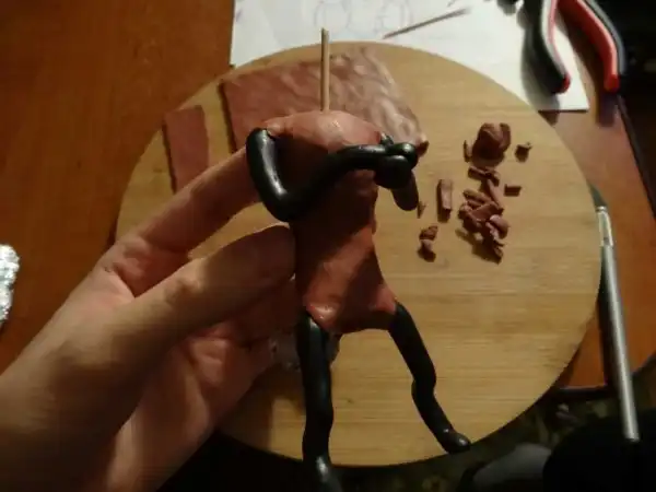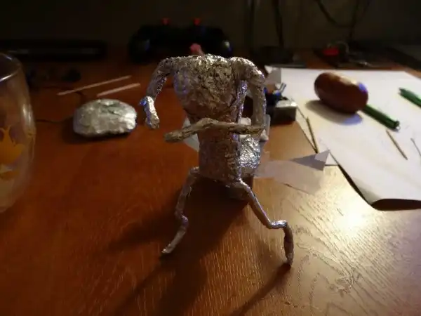 Для экономии полимерной глины (дорога нынче) и облегчения фигурки каркас облепливаем фольгой до нужного размера.
