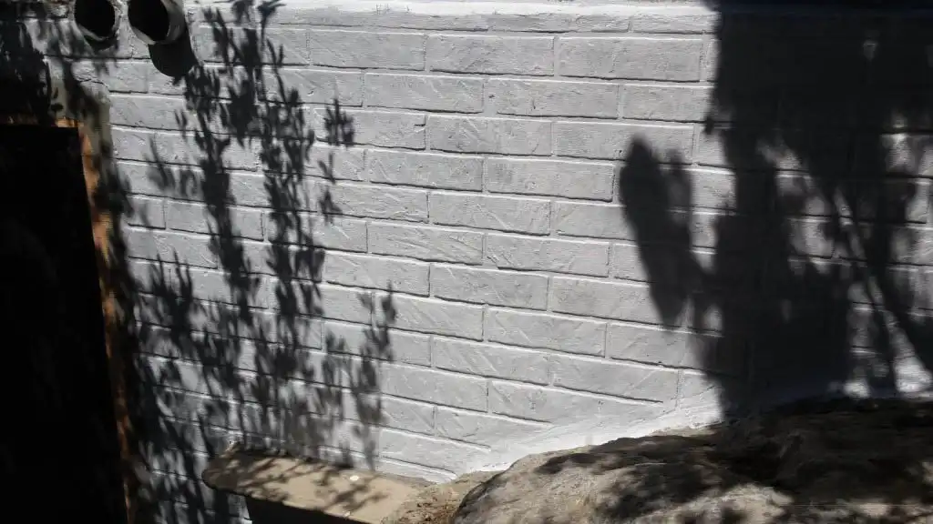 Затем пробил водяным уровнем, расчертил стену, сделал лекало и нарисовал кирпичи. Прогрунтовал. Купил малярный скотч 19 мм. Разрезал вдоль. Приклеил его по контурам кирпича.