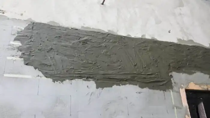 Подсыхает быстро.Зачищаем ложкой, грунтуем и сверху гидроизоляцию