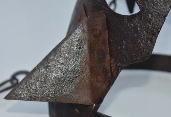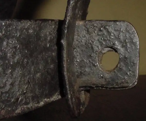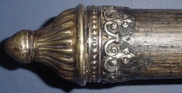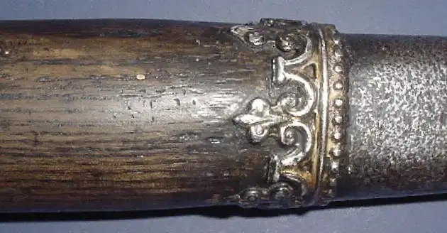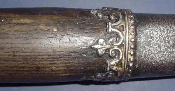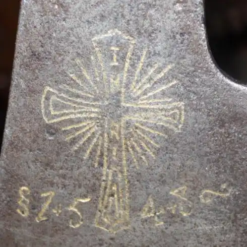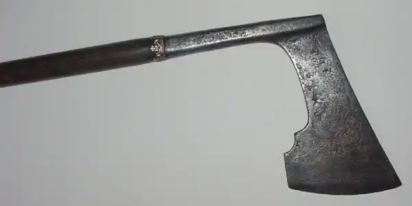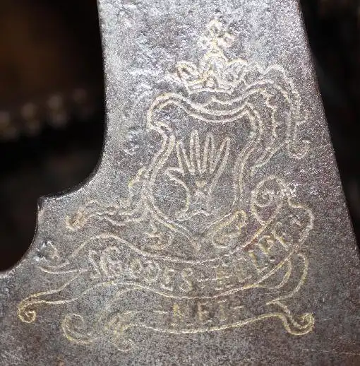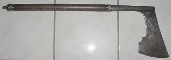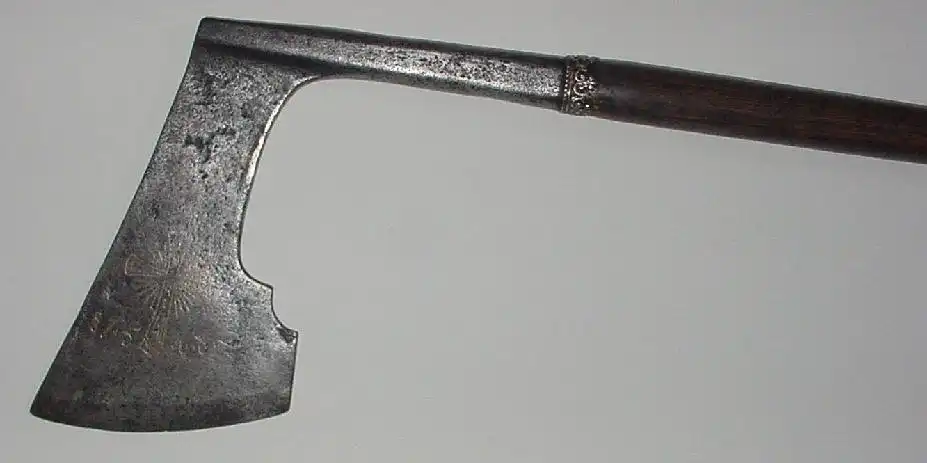 Это специализированный малый топор палача, предназначенный не для отрубания голов, я для усекновения иных частей тела - рук, например. Общая длина топора с топорищем 880 мм, длина рабочей части по обушной стороне 222 мм, длина рабочей части по спинке 237 мм, ширина 165 мм. На одной стороне топора изображение отрубленной руки в поле щита под короной и надпись под щитом , на староанглийском вписанная в два баннера: "GODES+HELPE+MEI+", на другой стороне изображение креста с надписью "INRI" и датой 1548 год.