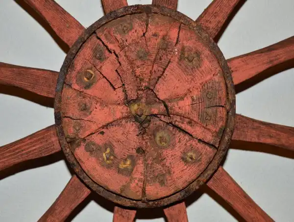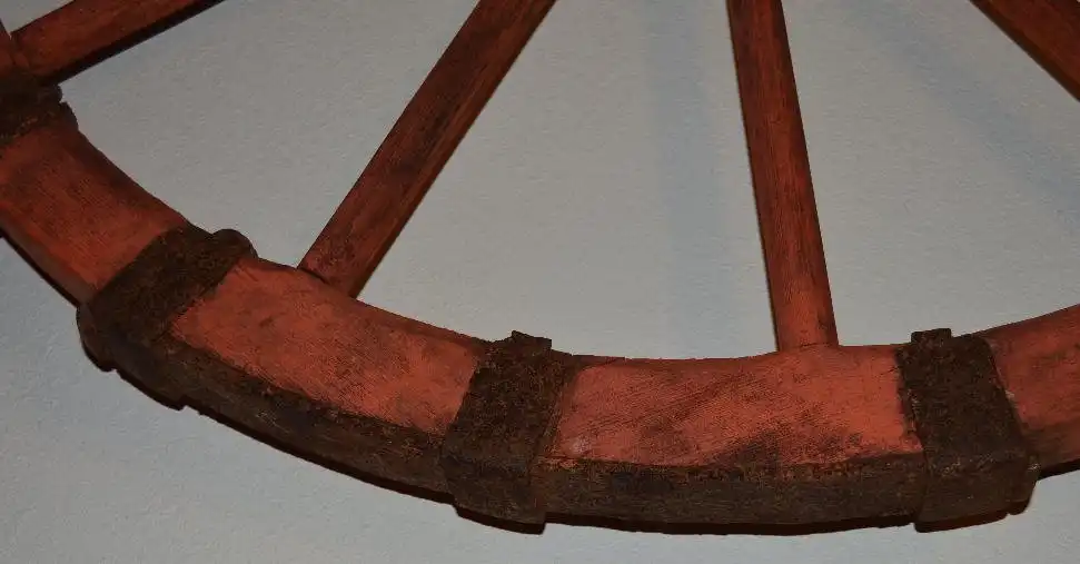 Конкретно это колесо 1230 мм в диаметре, вес около 30 кг, обод 55 мм шириной, и 64 мм высотой, 12 спиц, символизирующие 12 апостолов. Покрашено в красный цвет, что символизирует кровь Христову. Колесо оснащено металлическим утяжелителем-концентратором для дробления костей длиной 356 мм, 75 мм высотой, и шириной у основания 12,5 мм, а у "рабочей части" 8 мм.