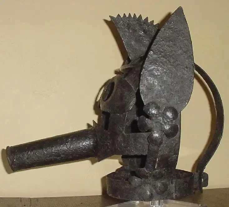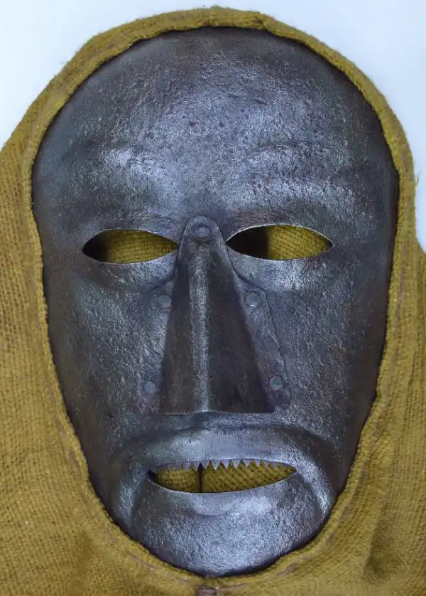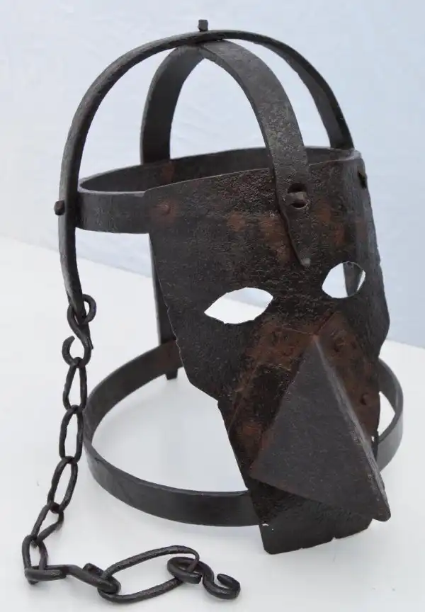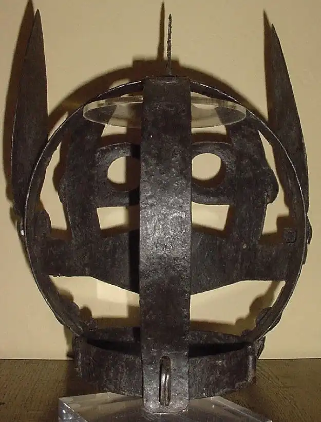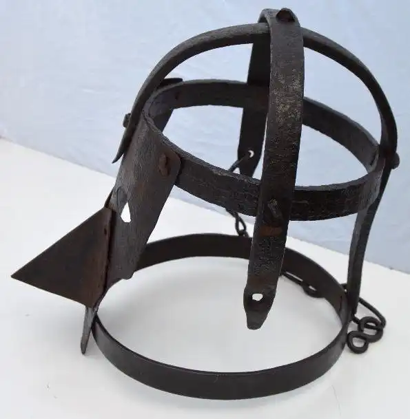Германская маска позора. Мужская. 17 век. Такая вот штуковина надевалась на башку, застегивалась под подбородком цепком, и вас выставляли на всеобщее обозрение. Весело и радостно было всем. Кроме того, кто в маске.