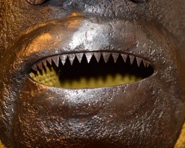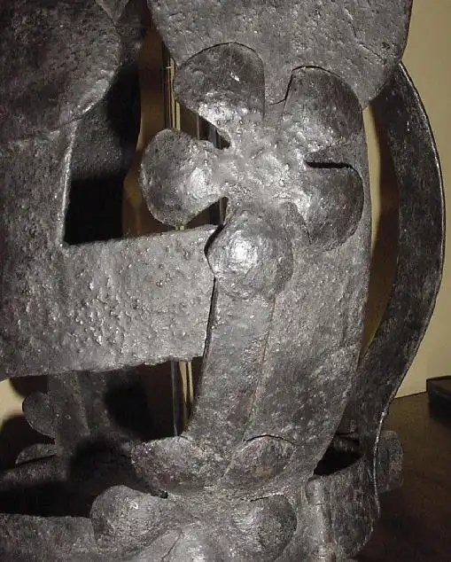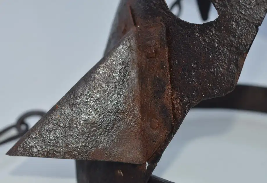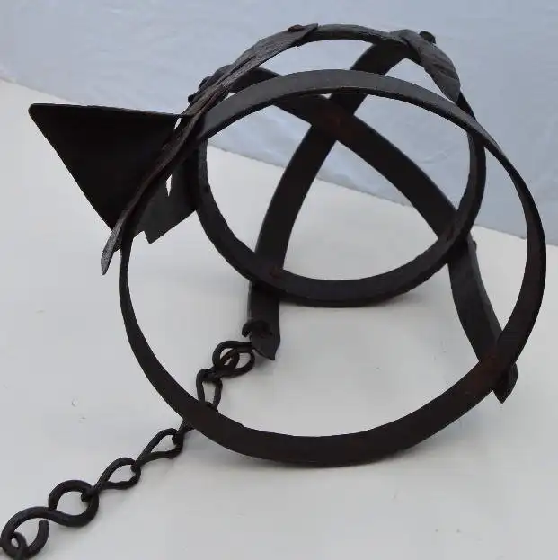 Германия 17 век. Длина девайса 445 мм, ширина 279 мм, высота 368 мм, вес 2730 грамм. Маски позора стали широко применяться с конца 16 века, и в Германских княжествах подобное наказание существовало вплоть до конца 18 века! Применялись сии устройства для лиц совершивших, постыдные поступки, за своей мелочностью не подпадавшие под уголовщину (говоря современным языком "административные правонарушения"). В частности такую фигню вам могли напялить на башку за: обжорство, мелкую драку, кощунство, грубое ("свинское") поведение, пьянство, и т.д. и т.п. Для женщин основным поводом для такого наказания были сплетни и стервозность в быту. Причем внешний вид масок должен был указывать на проступки совершенные наказуемым, именно поэтому две одинаковые маски позора найти практически невозможно. Так свиное рыло на маске указывало на хамское поведение и пьянство ее носителя. Большие уши на любителя (любительницу) подслушивать. Маска с длинным языком надевалась на грубиянов и сплетниц. Ну и так далее. Наказуемого с ентой *болой на голове выставляли на всеобщее обозрение, как правило на центральной площади города, и радующиеся сограждане (а с развлечениями было туго) могли пожурить его (ее), покидаться отходами, ну или каким иным способом выразить свое восхищение поведением земляка (рукоприкладство по отношению к наказуемому было запрещено!). Конкретно эта маска скорее всего женская.