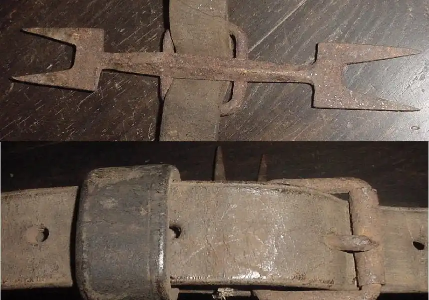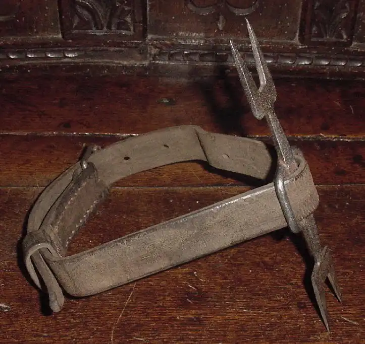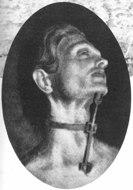 Это не столовый прибор, ежели что. Само устройство 16-17 веков, из коллекции замка Rodenegg, Австрия. Степень натяжения ремня регулирует усилие с которым вилочки упираются в подбородок и грудину. Клиент таким образом, по желанию пытающего, мог испытывать всю гамму чуйств - от легкого дискомфорта, до страшных мучений. В книге "La storia dell Inquisizione", Карла Хавоша, говорится о том, что мало кто из еретиков выдерживал более суток в таком положении, на максимально затянутом ремне. Причем палачу вообще не надо было напрягаться)))). Применение девайса на последней фоточке. Честь изобретения устройства приписывают Игнатию Лойоле.