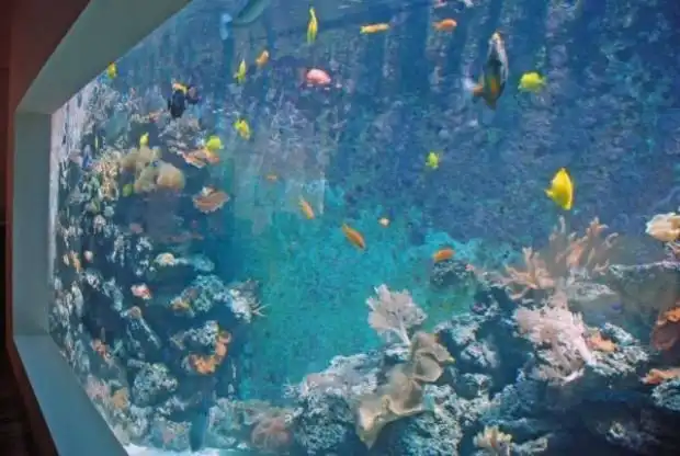 Аквариум длиной 6 метров вмещает в себя 30 000 литров воды, к тому же он наделен специальной системой фильтрации воды.