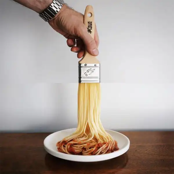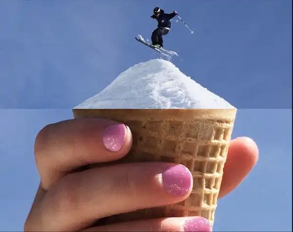 Сюрреалистические кадры включают лыжника на вершине мороженого, и макароны и тефтели на ковше погрузчика, экскаватор черпает из мороженого, и вишневый шар для боулинга
