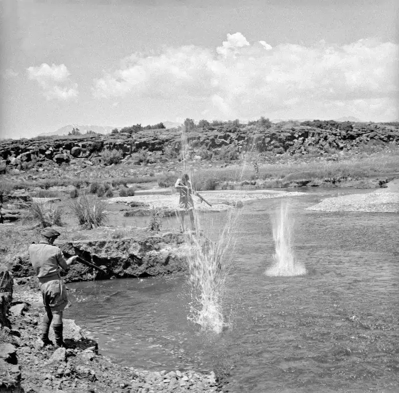 Новозеландские солдаты на берегу реки стреляют по форели на турецко-сирийской границе. 1942 год