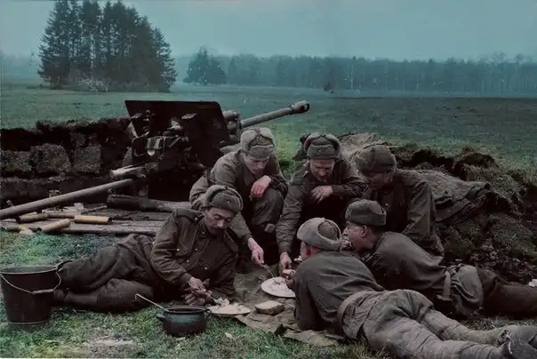 Расчёт пушки ЗиС-3 за обедом в Германии. 1945 год.